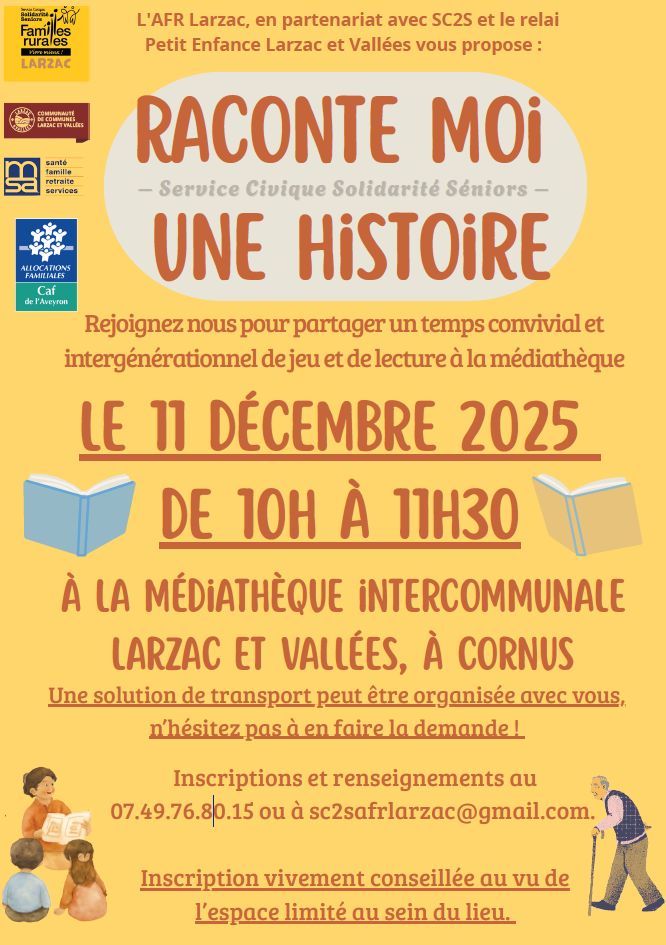 L’Association Familles Rurales du Larzac, en partenariat avec SC2S et le relais Petit Enfance Larzac et Vallées vous propose de les rejoindre pour partager un temps convivial et intergénérationnel de jeu et de lecture à la médiathèque intercommunale à Cornus le 11 décembre 2025 de 10h à 11h30. Inscriptions et renseignements au 07.49.76.80.15 ou à […]