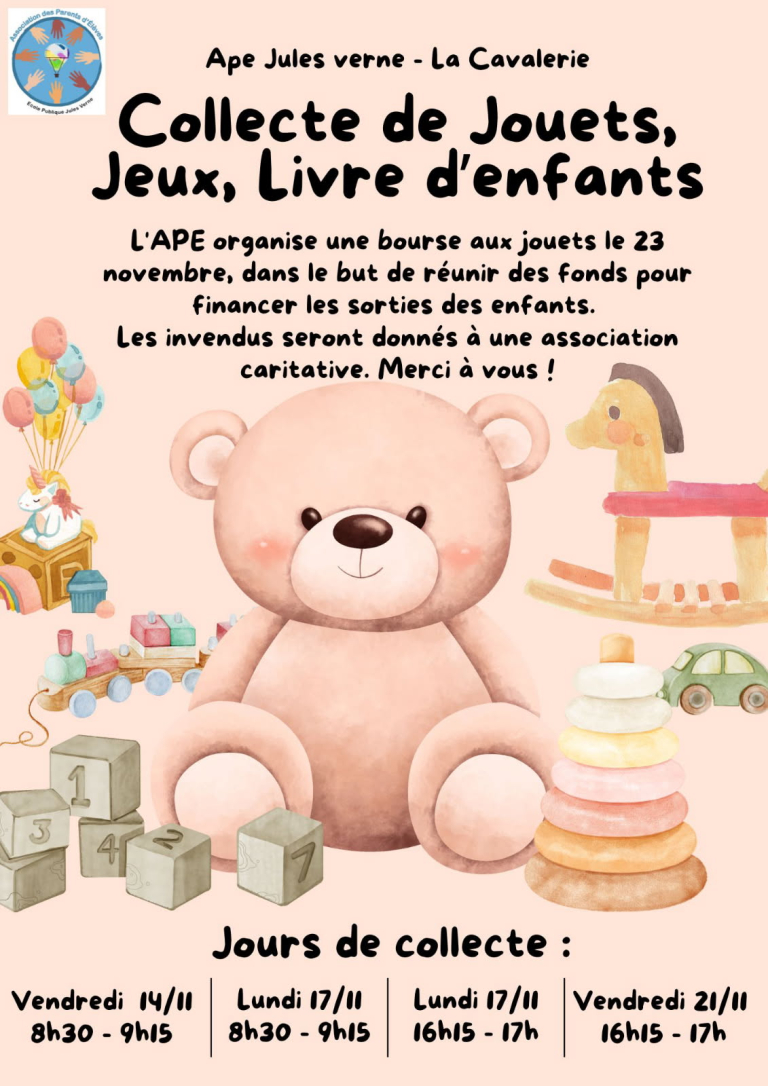 L’Association des Parents d’Élèves de l’école publique Jules Verne de La Cavalerie organise sa Bourse aux jouets, livres et habits enfants !