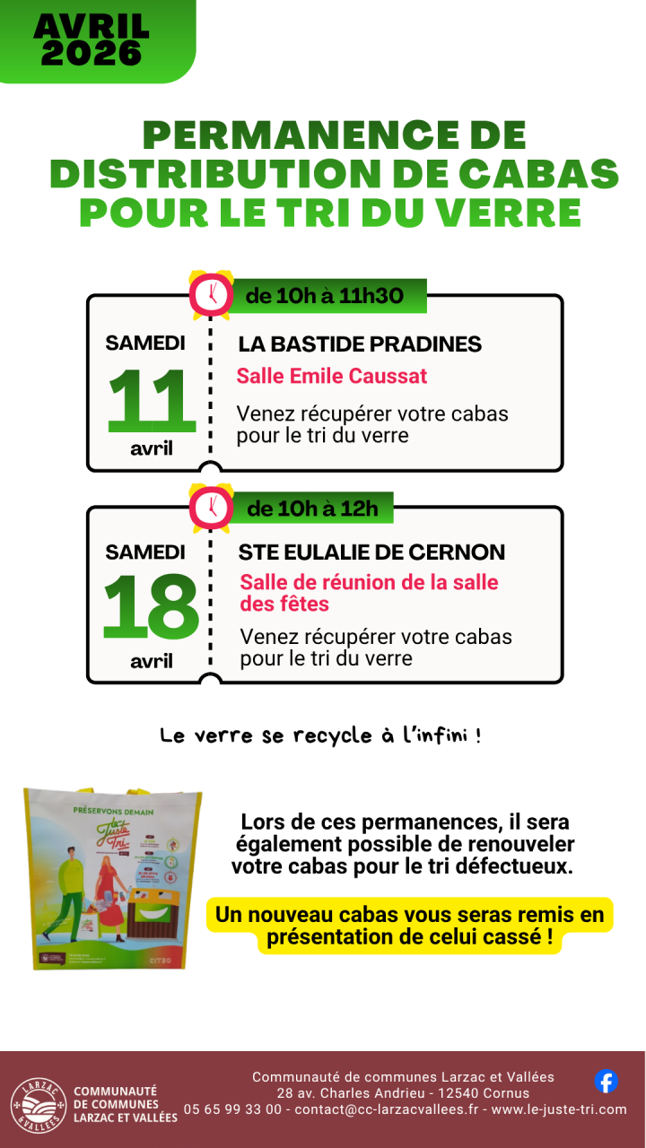 Une permanence de distribution de cabas pour le tri du verre aura lieu le samedi 18 avril 2026 de 10h à 12h.